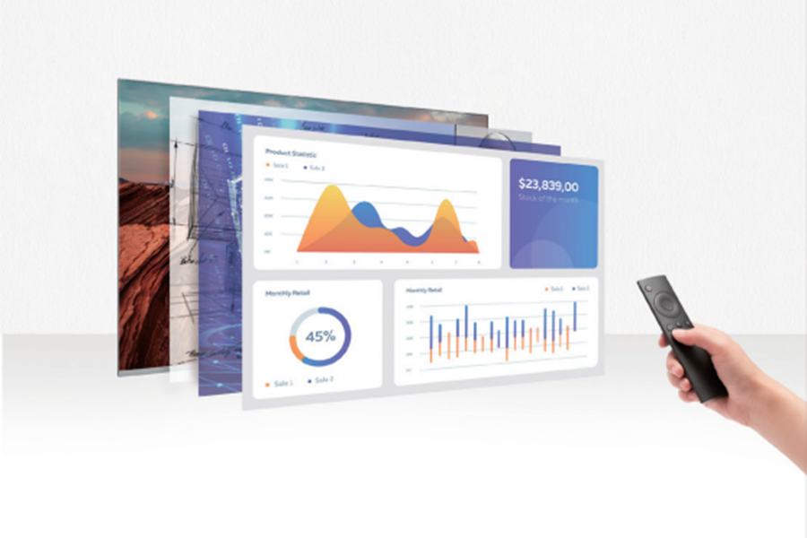 ④ 遙控控制,無線極速投屏:像操控一臺大電視一樣簡單易用,可通過遙控器實現開關機、亮度/色溫調節,內容切換,上下翻頁等功能。支持電腦、手機、平板等設備投屏,多種設備同時在線操作,分享不受“線”制。