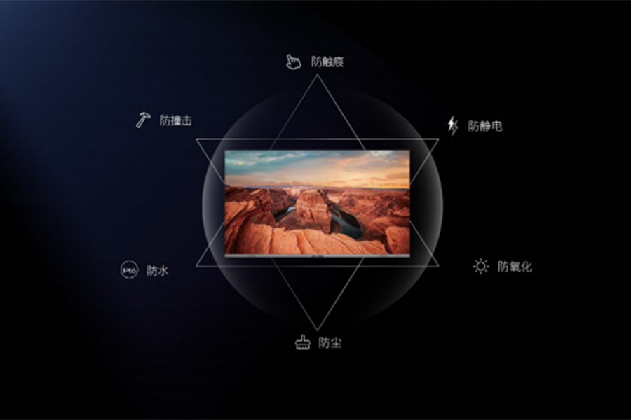 ⑥ 綠色節能,六星級防護水準:多重創新性的綠色節能技術,同等條件下節能40%,待機模式下功耗僅為0.5W,實現綠色低碳。采用面板式封裝處理工藝,有效保護發光芯片和內部器件,讓屏體輕松應對各種環境考驗,使用壽命長達10,0000小時以上。