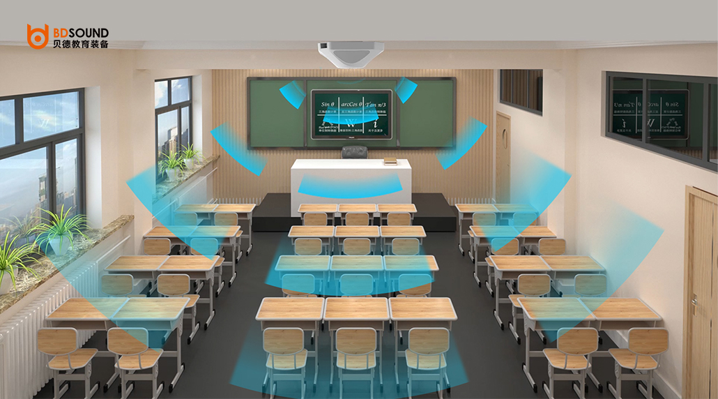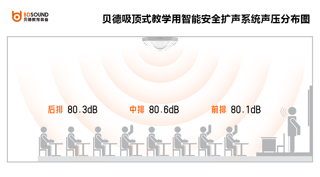 ● 均勻的聲場分布:聲頻360°等聲壓均勻覆蓋每個角落教室內(nèi)各個位置的聲壓差值在4dB以內(nèi);